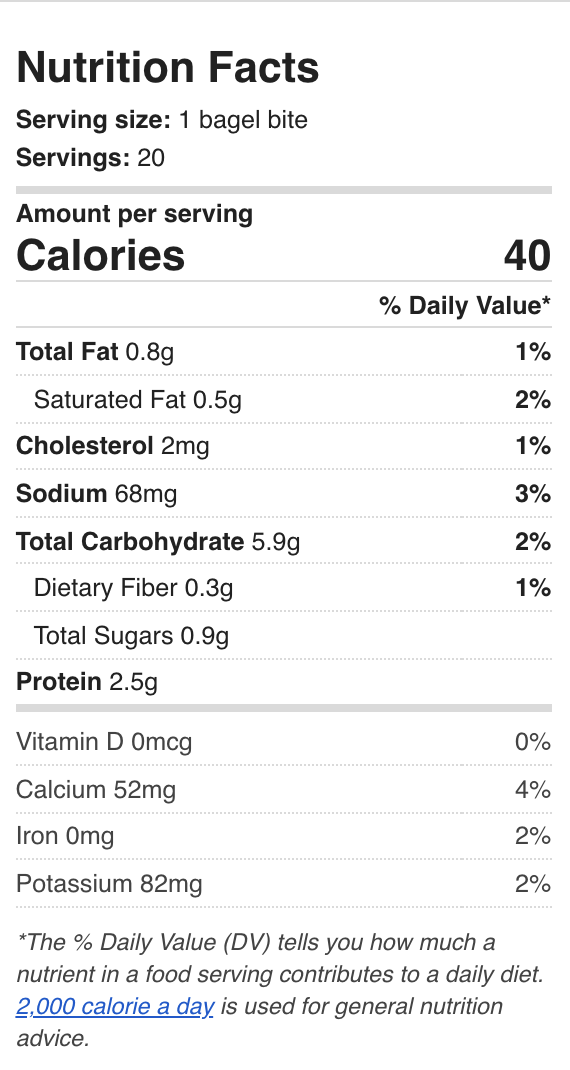 Bagel Bites Ingredients: Are Bagel Bites Good for You? - MEL Magazine Bagel Bites Ingredients: The Bagel Halves. 1) Enriched Flour (Wheat Flour, Enzyme, Ascorbic Acid, Niacin, Reduced Iron, Thiamine, Mononitrate, Riboflavin, Folic Acid): As we learned in our exploration of the many, many, many ingredients in the McDonald's Big Mac, enriched flour is far less "enriched" than the name would have you believe. Homemade Bagel Bites - The Spruce Eats Preheat the oven to 425 F. Arrange the bagels on two baking sheets, cut-size up. Place in the oven as it preheats for about 5 minutes, or until the bagels feel toasted but aren't yet browned. The Spruce / Laurel Randolph. Top each bagel with about a tablespoon of tomato sauce, spreading lightly to cover. New York Bagels - Nutritional Information Bagel Nutritional Information. Note: Each Nutritional sheet below has 3 columns. for our Large Bagels, see "Hand-Rolled" (right column) for Mini Bagels, see "Mini" (left column) for Flat Bagels, see "Large" (center column) Apple Cinnamon Raisin bagels. Blueberry bagels. Cinnamon Raisin bagels. Cranberry Energy bagels. Bagel Bites Nutrition Facts - Dmcoffee.blog Calories, fat, protein, and carbohydrate values for Bagel Bites. Calories. There are 50 calories in Bagel Bites. protein 1.3g. carbs 7.7g. fat 1.5g. 50 calories. Nutrition Facts. Bagel Bites. Serving Size: 1. piece (15 g grams) Amount Per Serving. Calories from Fat 14. Calories 50 % Daily Value * 2% Total Fat 1.5 g grams. 2% Saturated Fat 0.4 g ...