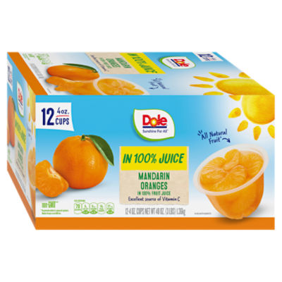 Dole Mandarin Oranges in 100% Fruit Juice (4 oz., 16 pk.) Mandarin oranges in 100% fruit juice. Made with all-natural fruit. Rich in vitamin C. Only 100 calories per cup. Naturally fat-free. Shipping Info. Standard - 4 to 10 business days. Ship Info.