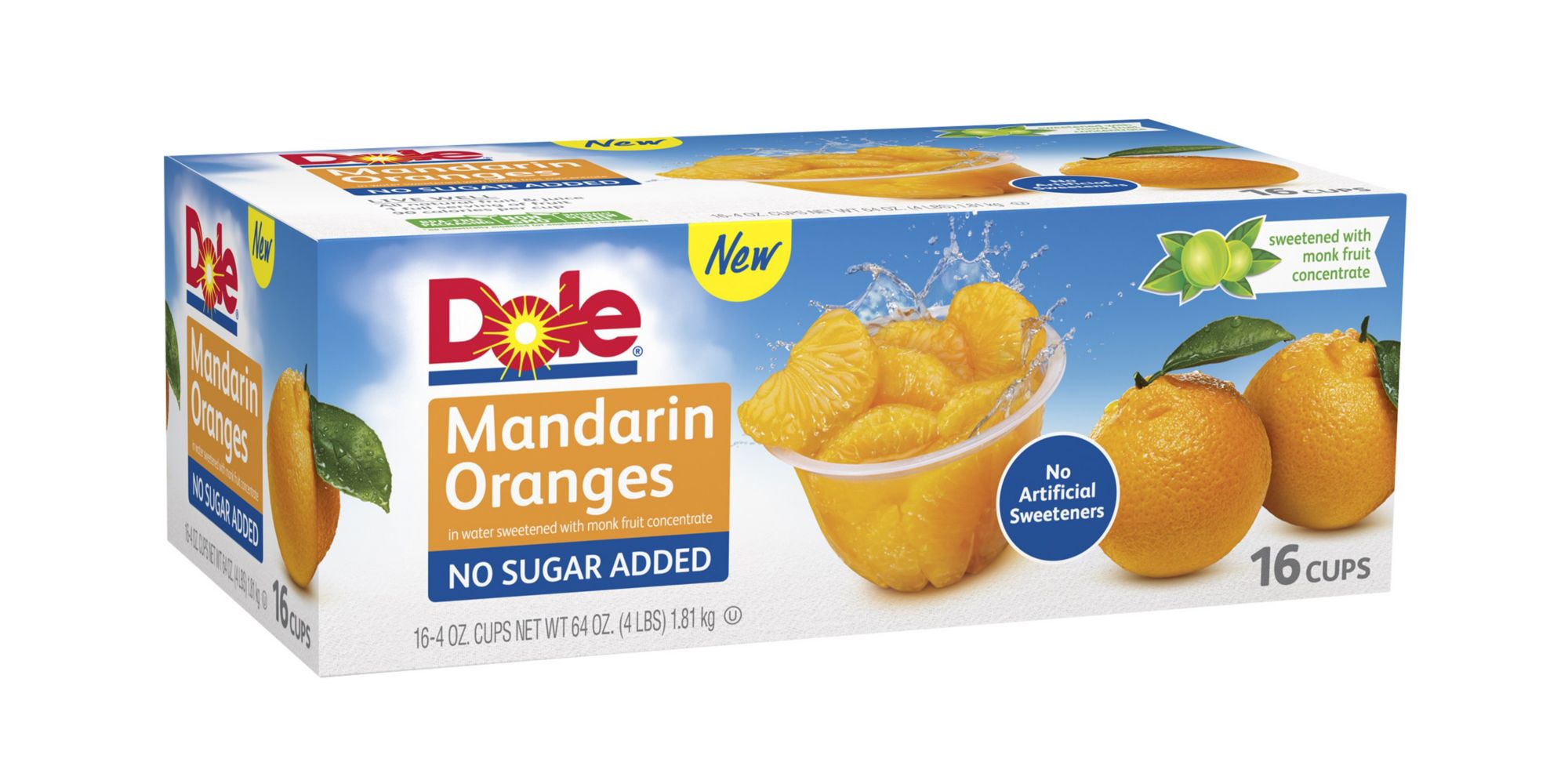 Mandarin Oranges with No Sugar Added 16oz - Dole® Sunshine Dole Mandarin Oranges with No Sugar Added are so convenient and super tasty. These little cups help me meet my fruit goals - and I don't have to peel the fruit. That's a plus for me because if I had to peel it I would not eat it. There is a lot of juice in the cups so try not to squeeze the cup when you are opening the cups. You will get squirted.