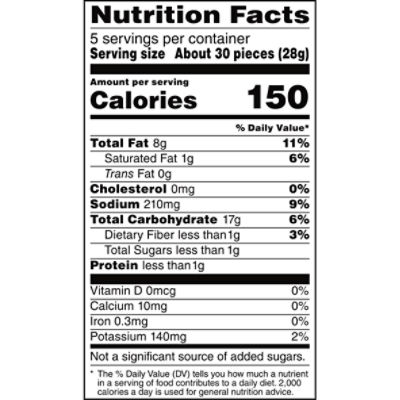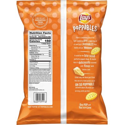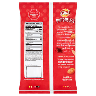 Lay's Poppables Sea Salted Crispy Potato Snacks, 5 oz - Kroger Nutrition Facts servings per container Serving size 30pieces (28 g) Amount per serving Calories 150 % Daily value* Total Fat 8g 10.26% Saturated Fat 1g 5% Trans Fat 0g Cholesterol 0mg 0% Sodium 200mg 8.7% Total Carbohydrate 16g 5.82% Dietary Fiber 1g 3.57% Sugar 0g Protein 1g Calcium 0mg 0% Iron 0.3mg 2% Potassium 230mg 4% Vitamin D 0mcg 0% LAY'S - Lays Poppables White Ched (5 ounces) | Winn-Dixie delivery ... LAY'S - Lays Poppables White Ched (5 ounces) | Winn-Dixie delivery - available in as little as two hours Dairy Deli Frozen Meat & Seafood Bakery Beer & Wine Beverages Snacks Produce Household Home Lays Poppables White Ched 5 ounces Brand: LAY'S Product Code: 00028400637695 Add to Cart Potassium 4% Calcium Iron Vitamin D