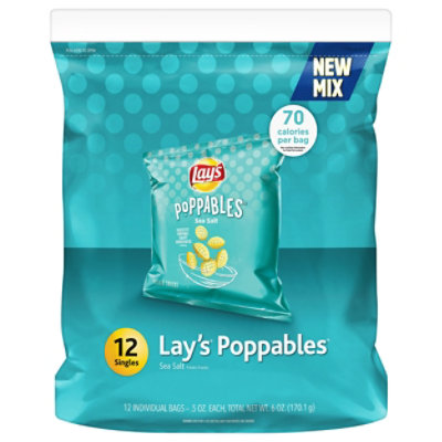 Amazon.com: lays poppables snack size Lay's Poppables Sea Salt & Lay's Poppables White Cheddar Perfectly Poppable Crispy Potato Bites Net Wt 5 Oz (4) 5 Ounce (Pack of 4) 4.7 out of 5 stars 14. $29.98 $ 29. 98 ($6.00/Ounce) FREE delivery Nov 28 - 30 . Only 10 left in stock - order soon. Options: 3 sizes. Add to Cart ${quantity} in cart- Nutrition Facts for Lay's Sea Salt Poppables • MyFoodDiary® Lay's Sea Salt Poppables Nutrition Facts Serving Size pieces 30 pieces = 28g Amount Per Serving 150 Calories % Daily Value* 14% Total Fat 9g 5% Saturated Fat 1g Trans Fat 0g 0% Cholesterol 0mg 9% Sodium 200mg 5% Total Carbohydrate 15g 4% Dietary Fiber 1g Total Sugars 0g 0% Includes 0g Added Sugars Protein 0g 0% Vitamin D 0mcg 0% Calcium 0mg Lay's Poppables Sea Salt, Potato Snacks - shoprite.com Lay's Poppables Sea Salt Potato Snacks Party Size, 8 1/8 oz Wherever celebrations and good times happen, the Lay's brand will be there just as it has been for more than 75 years. ... * The % Daily Value (DV) tells you how much a nutrient in a serving of food contributes to a daily diet. 2,000 calories a day is used for general nutrition advice ...