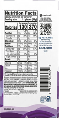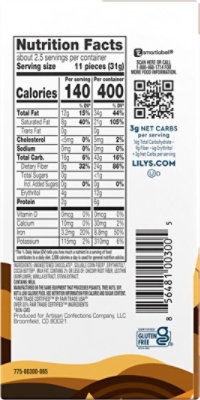 Is Lily's Chocolate Keto Friendly? | Dr Workout Lily's Chocolate Nutrition Facts. With almost all the natural ingredients except sweeteners lily's chocolates are nutritionally rich. A single serve of 30 grams of the chocolate provides a good amount of energy and fulfils significant percentage of daily value of fat required. Nutritional facts for 30 grams of some variety of lily's ...