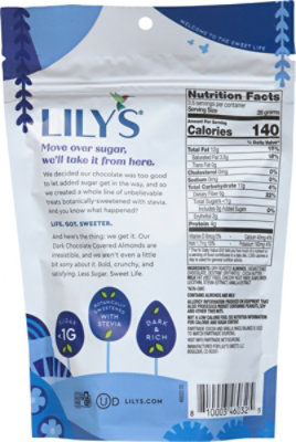 Lily's Calories and Nutrition Information. Page 1 Calories and nutrition information for Lily's products. Page 1. Calories and nutrition information for Lily's products. Page 1. Toggle navigation Toggle search bar. App ... Almond Dark Chocolate Style. 0.5 bar : 180: Almonds, Dark Chocolate Covered. 1 oz : 150: Almonds, Milk Chocolate Style Covered. 1 oz : 140: Baking Bar, Dark Chocolate.