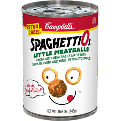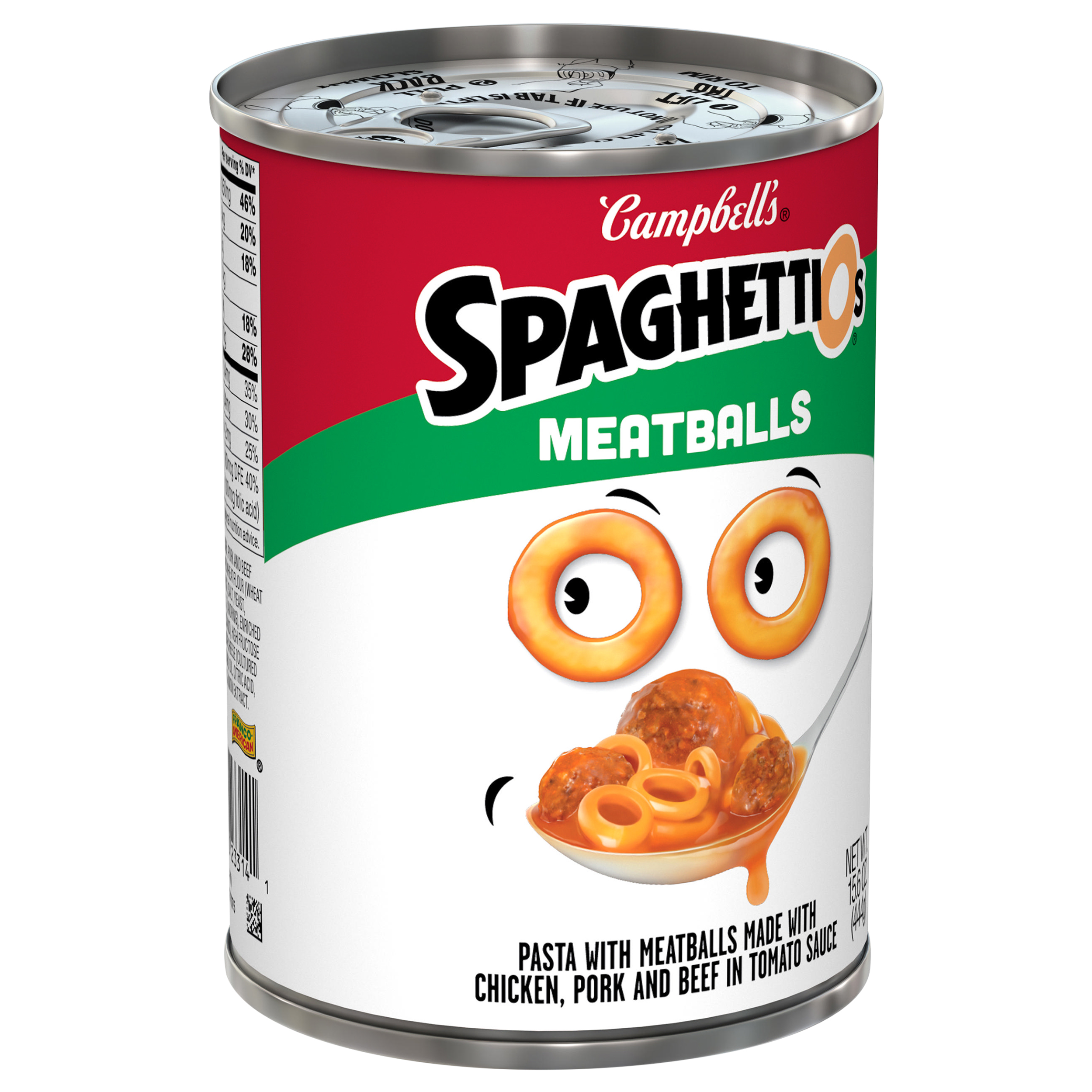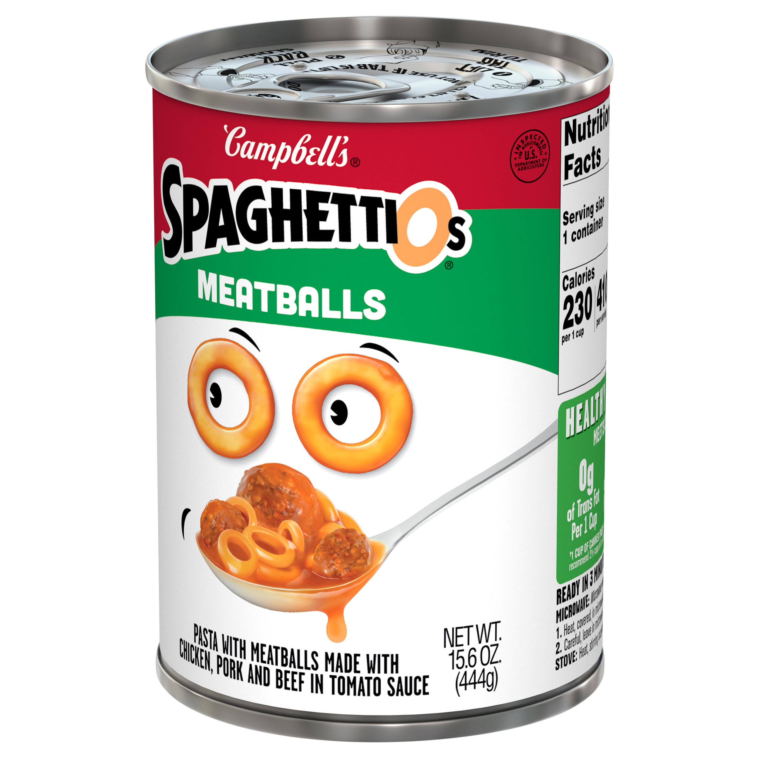 Adult "SpaghettiOs" Recipe | Bon Appétit These are extra saucy and a little sweet like the original SpaghettiOs, but with grown-up flavors all around. Ingredients 4 to 6 Servings 2 28-ounce cans whole peeled tomatoes ¼ cup panko... Spaghettios Canned Pasta With Meatballs - 15.6oz : Target One (1) 15.6 oz can of SpaghettiOs Canned Pasta with Meatballs. Neat o-shaped pasta that adds character to every bite. Canned SpaghettiOs feature delicious tomato sauce and meatballs made with pork, chicken and beef for a snack the whole family will love. Meatball pasta with tomato sauce features 1/2 cup of vegetables and 11 grams of protein ... SpaghettiOs® with Meatballs - Campbell Soup Company This canned pasta puts a spin on original SpaghettiOs® with the addition of sliced franks. One cup of microwave pasta has 1/2 cup of vegetables and 9 grams of protein for a healthy snack or lunch. Make this canned food when you're craving tasty snacks. Original Canned Pasta CAMPBELL Soup Company, SPAGHETTIOS, SpaghettiO's with Meatballs ... - Self Optimum health: Weight gain: The good: This food is low in Cholesterol. The bad: This food is high in Sodium. This food also contains Trans Fat. Caloric Ratio Pyramid. Caloric Ratio Pyramid for CAMPBELL Soup Company, SPAGHETTIOS, SpaghettiO's with Meatballs.
