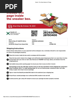 StockX_ Sacai new label.pdf - 17/07/2021 StockX: The Stock... As a reminder, StockX is not responsible for items not packaged properly.: 1 Place this invoice inside the box and/or envelope with the product. 2 Place the box and/or sleeve into a bigger and sufficiently sized shipping box that is no more than 2 inches (5 cm) larger than your item on each side.